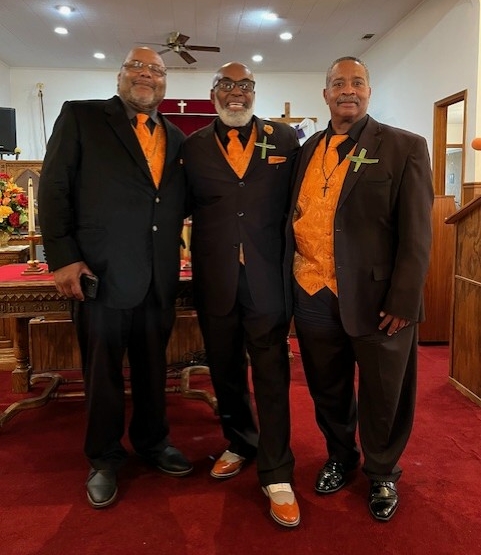 The Terrell’s Creek Missionary Baptist Church Male Chorus sings at their congregation every second Sunday of the month. The church is located at 3419 Old Greensboro Road, Chapel Hill, NC 27516. Shown here are John Farrington (left), Pastor Christopher Wade, (middle) and Danny Farrington (right). Musicians and a few other male Chorus Members are not shown.