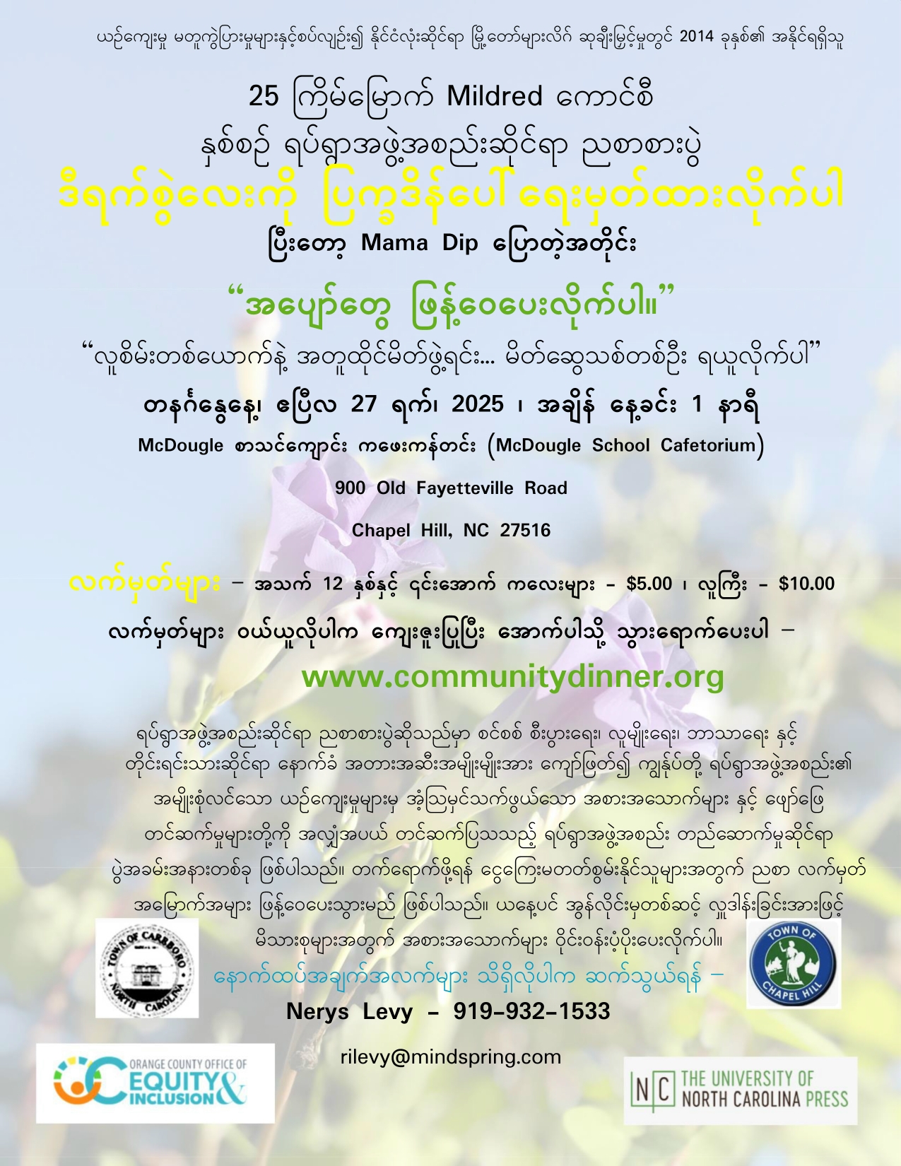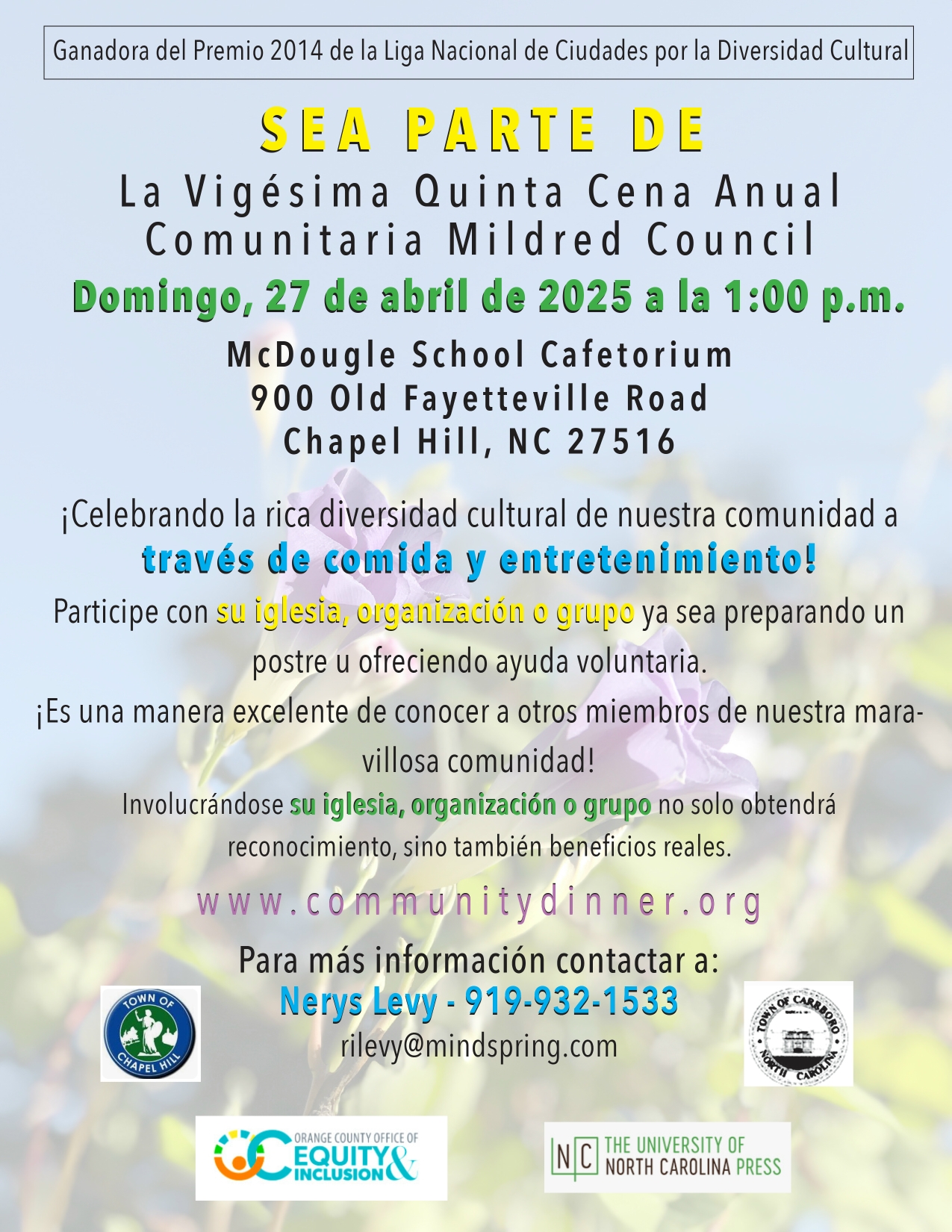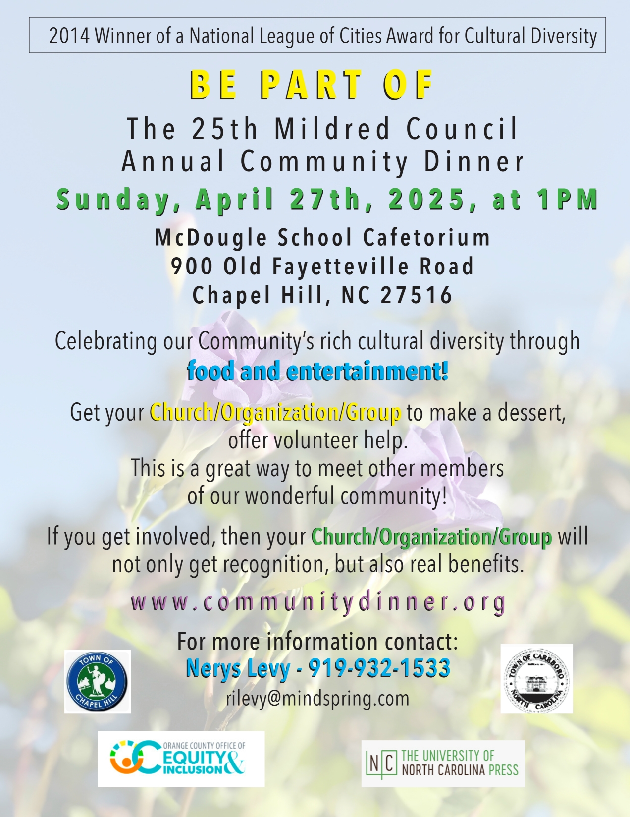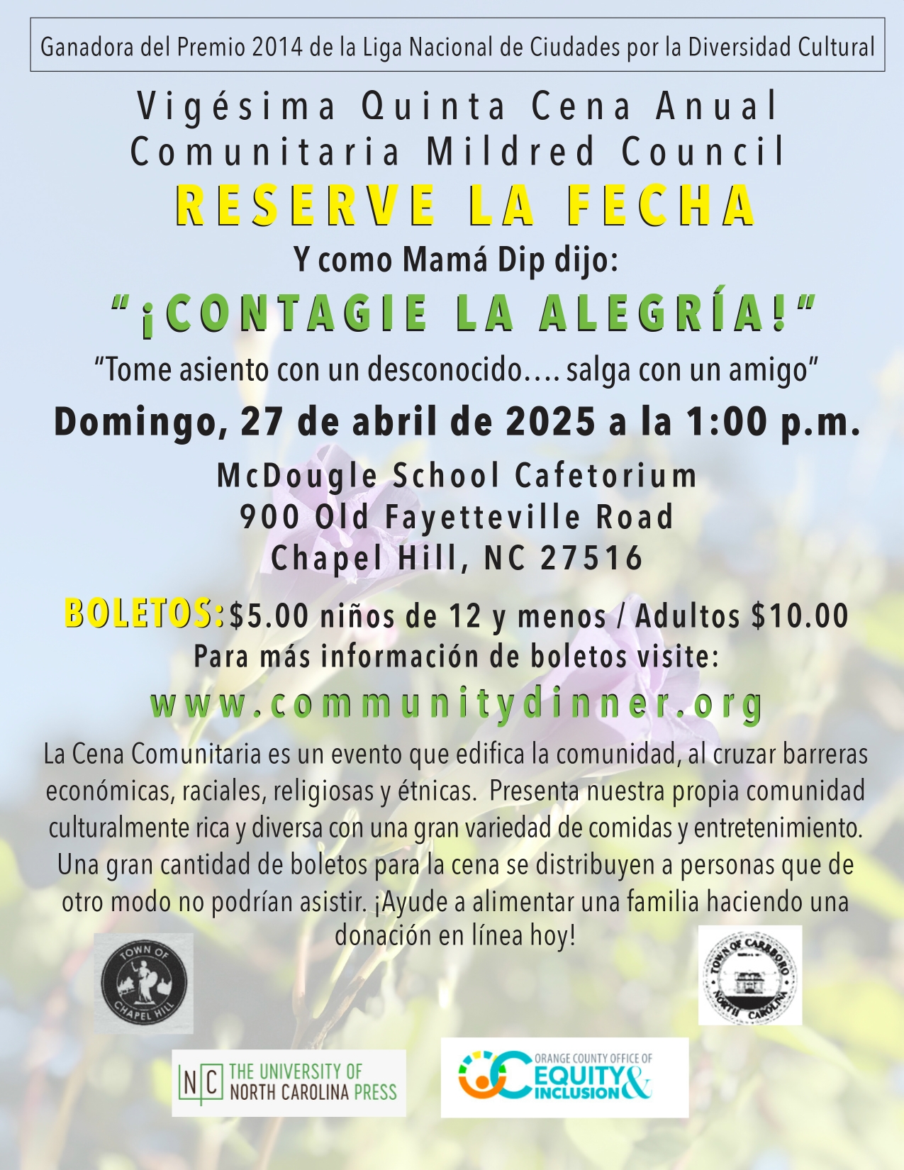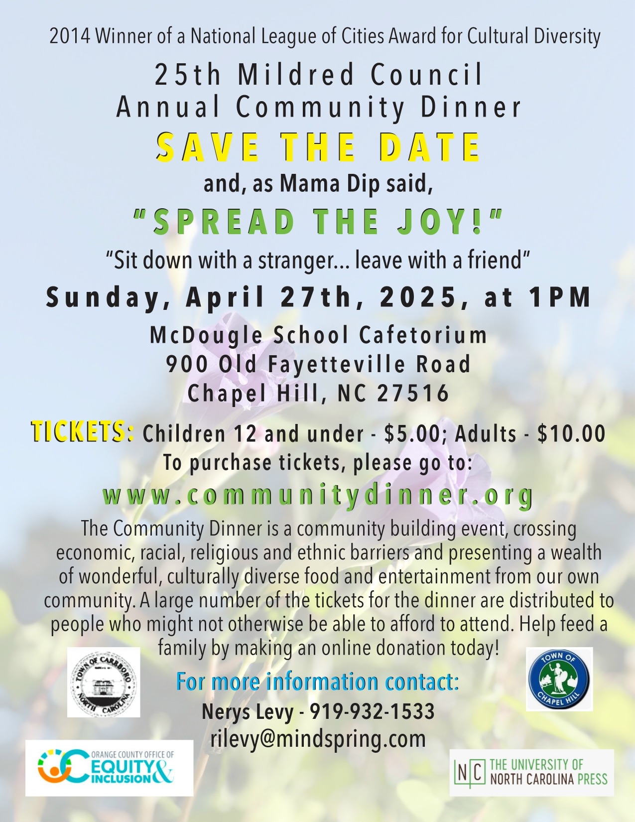 Mildred Council's family and the Community Dinner Committee are responsible for coordinating the menu. Our main caterer this year will be Beau Catering, Chapel Hill, supported by Mama Dip's Kitchen, and other local restaurants. We are pleased that the Council family is keeping their association with the event which was so important to their mother, Mama Dip. The fact that many local restaurants, churches and organizations donate side dishes and desserts completes the feast and gives attendees the opportunity to taste food from a wide cross section of our community.
